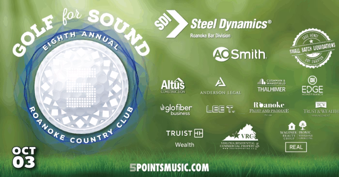 As a 501c3, sponsors are vital to the success of this event. Elevate your brand or organization by partnering with 5PTS Music and Golf For Sound, one of the Roanoke Valley’s best golf tournaments! To learn more, please contact Emily@5pointsmusic.com.